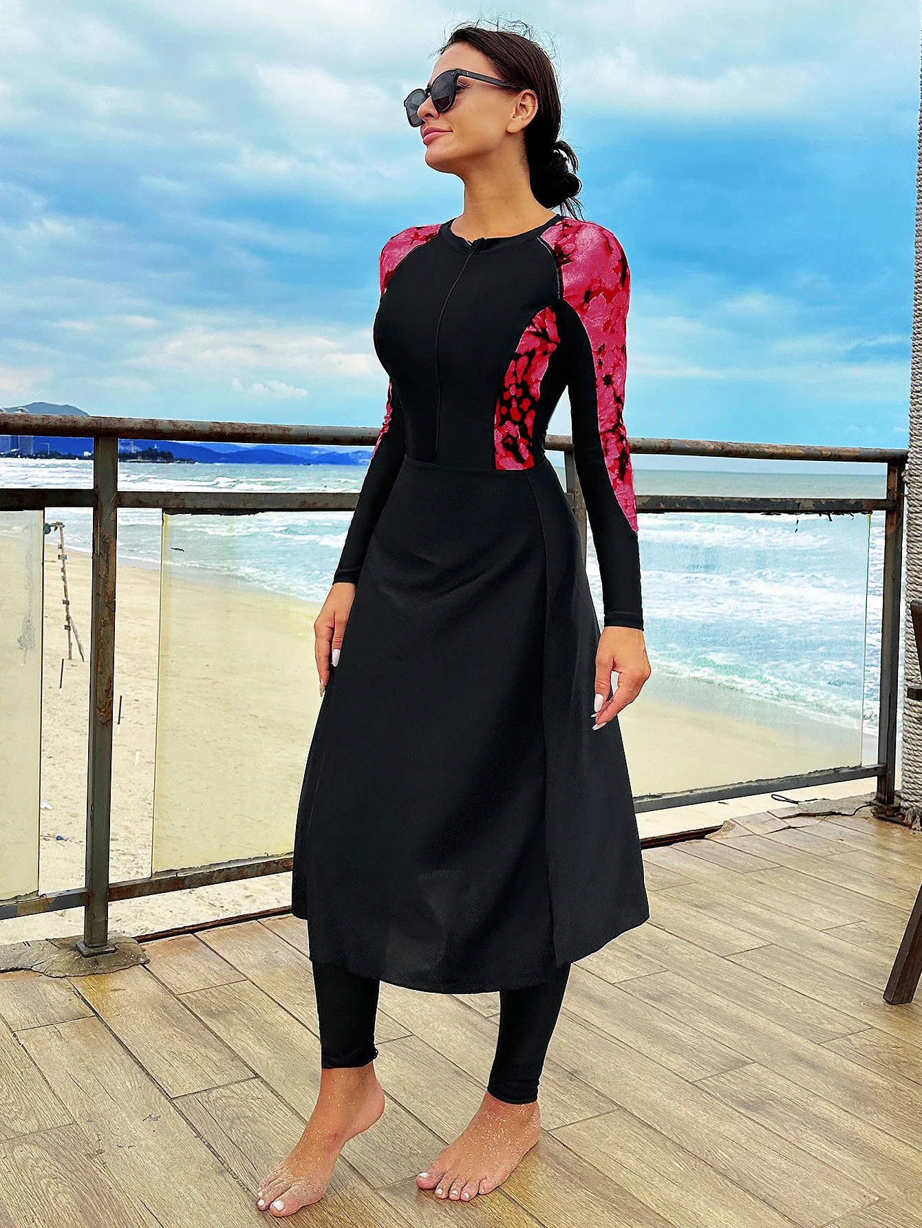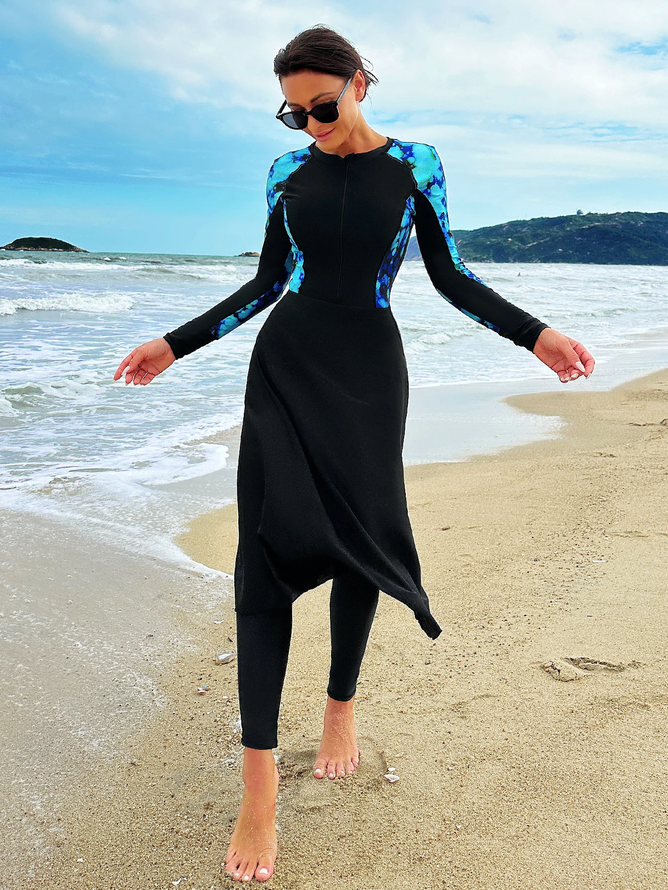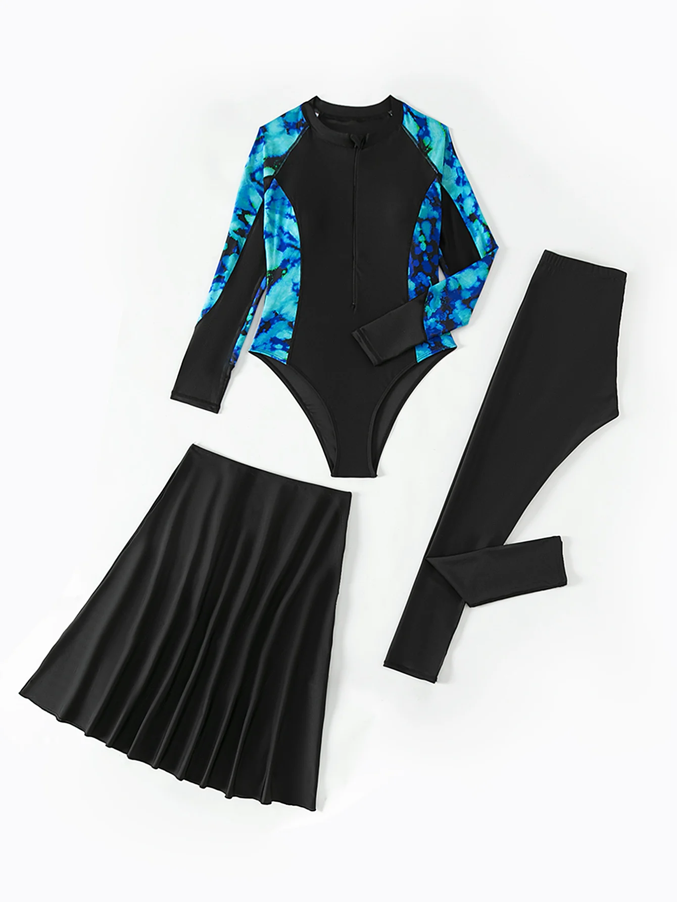 Ensemble de maillot de bain burkini composé de 3 pièces, alliant élégance et modestie avec un imprimé coloré. Ce modèle à manches longues comprend un pantalon long et une jupe, offrant une protection optimale SPF50+ pour un confort et une sécurité accrus lors de vos journées à la plage.
