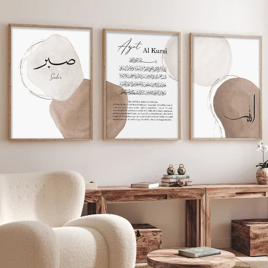 Apportez une touche spirituelle et artistique à votre intérieur avec ce cadre de calligraphie islamique représentant Ayat Al Kursi. Ce poster moderne, aux teintes marron géographiques sur fond circulaire, combine élégance et profondeur spirituelle. Idéal pour décorer votre maison pendant le Ramadan ou toute l'année, il offre un équilibre parfait entre tradition et design contemporain. Imprimé sur toile de qualité, ce tableau durable enrichit votre espace de prières et sérénité.